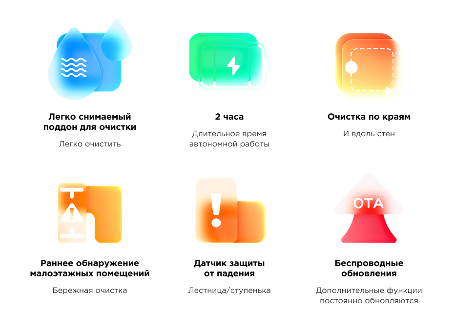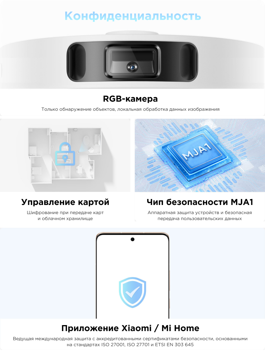Другие функции и возможности | автоматический забор мусора, заполнение контейнера водой, зарядная станция, полоскание мопов, автоматическое возвращение на зарядную станцию, голосовое управление через ассистентов |