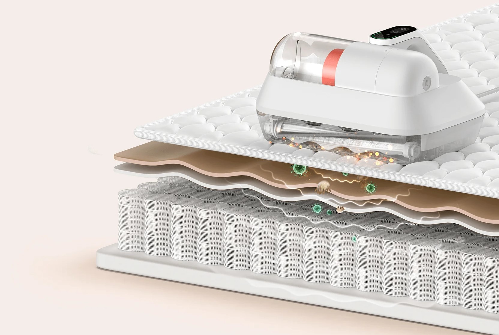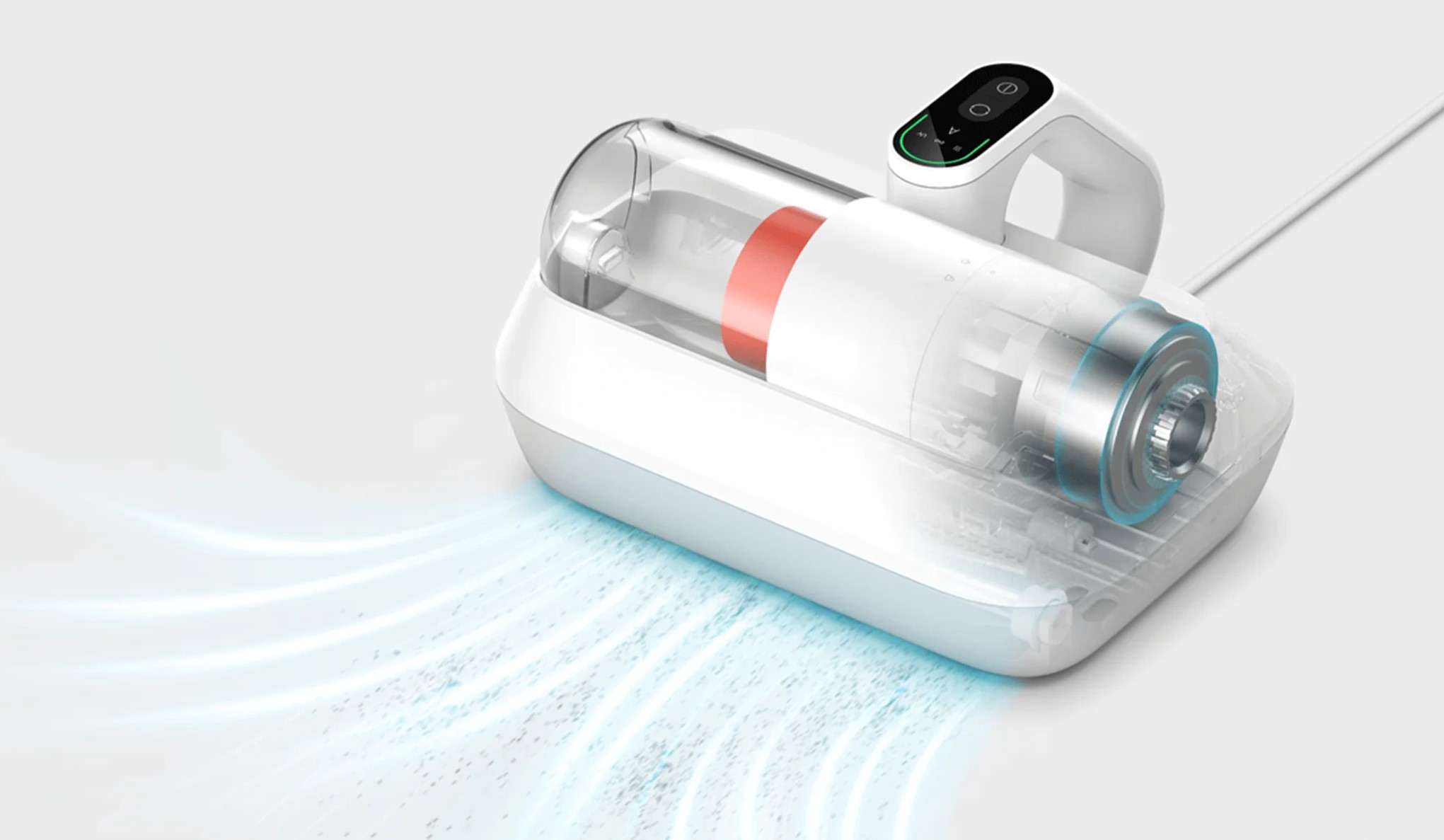 Пылесос Xiaomi Dust Mite Vacuum Cleaner Pro имеет светодиодный дисплей, который предоставляет информацию о процессе очистки в режиме реального времени. Встроенная интеллектуальная система датчиков анализирует наличие пылевых клещей в тканях и изменяет цвет индикатора в зависимости от уровня загрязнения. Трехцветный индикатор - зеленый, желтый и красный - позволяет легко определить состояние поверхности: от чистой до требующей немедленной очистки. Это позволяет понимать, насколько эффективна текущая уборка и когда необходимо продолжить процесс. Кроме того, дисплей отображает уровень заряда батареи, текущий режим работы и другие важные параметры, что делает управление устройством более интуитивным и удобным.