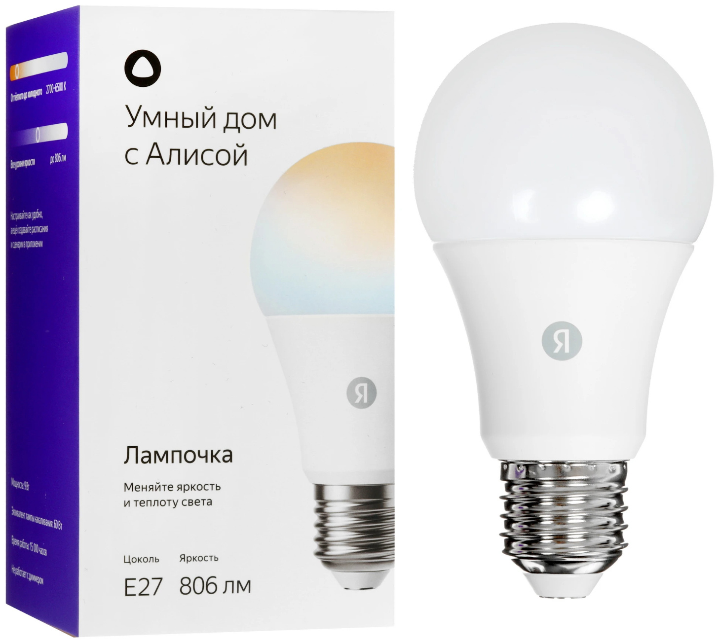 Дополнительно | мощность 9 Вт, цветовая температура 2700-6500 К, световой поток до 806 лм, цоколь Е27 |